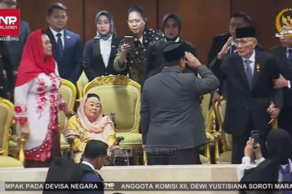 Presiden Prabowo Subianto melakukan sikap hormat kepada Wakil Presiden ke-6 Republik Indonesia Jenderal (purn) Try Sutrisno usai Sidang Tahunan MPR 2025, Jumat (15/8/2025).(Tangkapan layar) JAK...