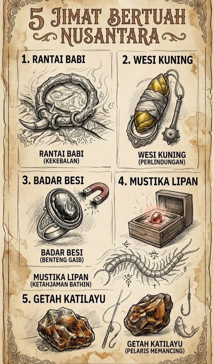 Berikut adalah 5 jimat bertuah yang sangat melegenda dalam cerita rakyat dan tradisi mistis Nusantara, lengkap dengan mitos kekuatan yang menyertainya: