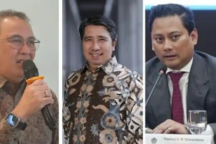 KANDIDAT – (kiri) Dicky Kartikoyono. (tengah) Solikin M. Juhro. (kanan) Wakil Menteri Keuangan II Thomas Djiwandono menyampaikan keterangan kepada wartawan di Kompleks Kemenkeu, Jakarta Pusat, K...