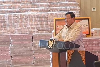 Presiden Prabowo Subianto memberikan sambutan dengan latar belakang uang Rp 2 triliun dari Rp 13,2 triliun hasil sitaan kasus pemberian fasilitas ekspor minyak sawit mentah atau crude palm oil (CPO) d...
