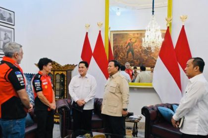Presiden Prabowo Subianto menerima kunjungan juara dunia MotoGP Marc Marquez bersama dua pembalap muda Indonesia, Mario Aji dan Veda Ega Pratama, di Istana Merdeka, Jakarta, pada Selasa, (30/9/2025). ...