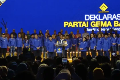 Ketua Umum Partai Gema Bangsa Ahmad Rofiq didampingi jajaran pengurus partai menyampaikan pidato politik saat deklarasi Partai Gema Bangsa di Jakarta, Sabtu (17/1/2026). (Dery Ridwansah/ JawaPos.com) ...