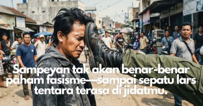 Fasisme baru terasa ketika kekuasaan hadir tanpa dialog. Ketika keputusan turun dari atas seperti palu, bukan seperti percakapan. Ketika suara dibungkam, bukan karena salah, tetapi karena berbeda. Dan sepatu lars tentara menempel di jidat rakyatnya sendiri—bukan sebagai pelindung, melainkan sebagai pengingat: siapa yang berkuasa, dan siapa yang harus tunduk.