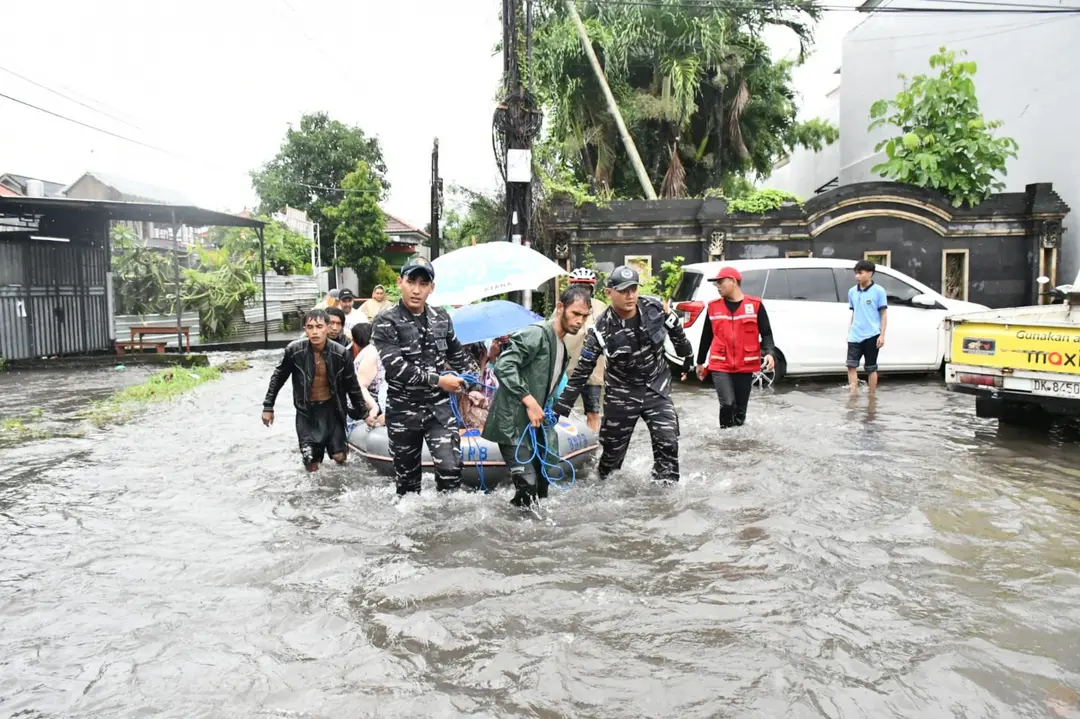 Intensitas hujan yang tinggi sejak dini hari menyebabkan sejumlah pemukiman warga terendam air dengan ketinggian mencapai pinggang orang dewasa. Menanggapi situasi darurat tersebut, Tim Quick Response Lanal Bali langsung diterjunkan ke lokasi dengan membawa perahu karet (rubber boat) dan peralatan keselamatan lainnya.