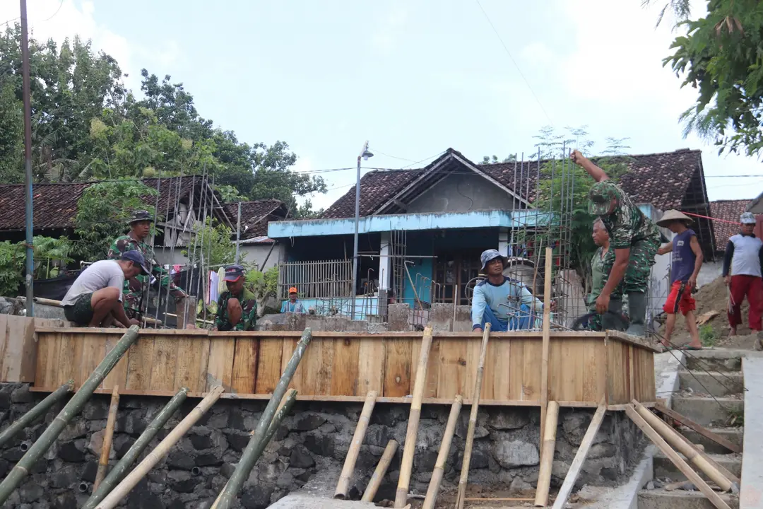 Anggota Kodim 0732/Sleman dan warga setempat bergotong royong membangun jembatan sebagai akses penghubung antar dusun Klaci dan Barak Margoluwih Seyegan Sleman.