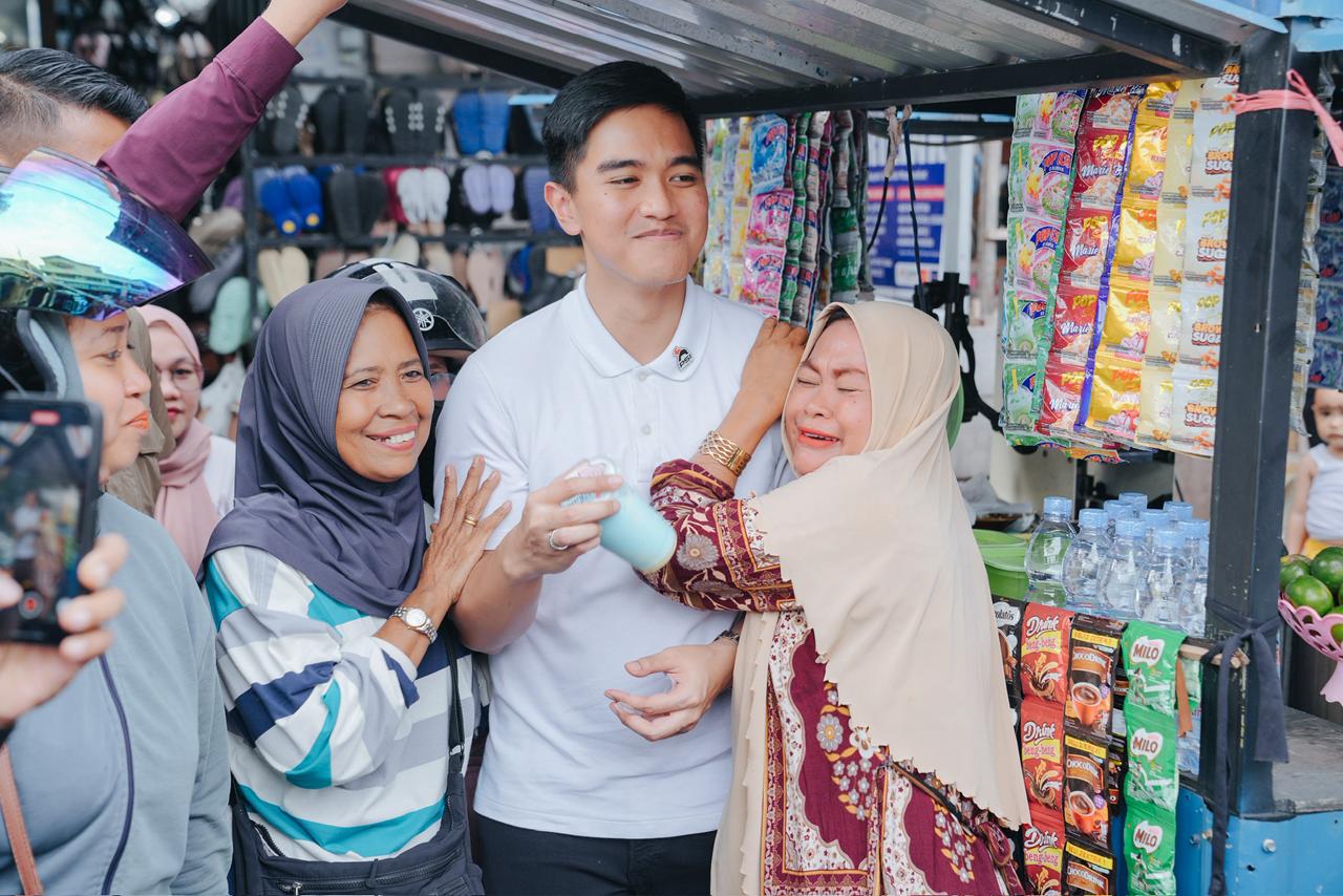 Pria kelahiran 25 Desember 1994 itu juga sempat berinteraksi dengan pengunjung pasar inpres. Seorang perempuan yang sedang hamil bahkan meminta Kaesang untuk mengelus perutnya.
