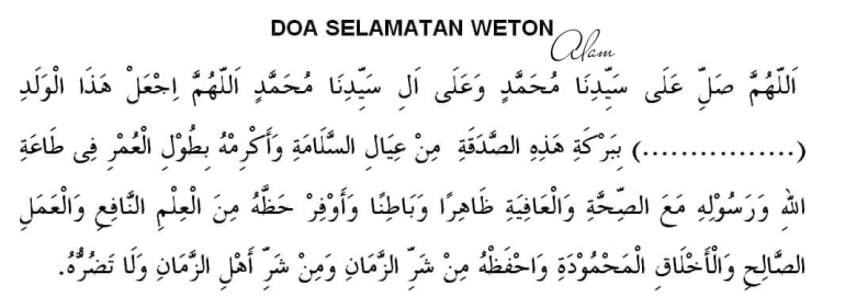 Allahumma sholli ‘ala sayyidinaa Muhammad Wa’ala ‘ali sayyidinaa Muhammad. Allahumma Ij’al Hadzal Walada …. Bibarkati Hadhihis Shodaqoti min iyalis salamati wa akrimhu bthulil umri fi thoatillahi warosulihi maas shihhati wal afiyati dhohiron wa bathinan. Wa aufirhu hadhohu minal ilmi an nafii wal amali asholihi wal akhlaqil mahmudati. Wahfadhhu min syarrizamani wamin syari ahliz zamani wala tadhurruhu.