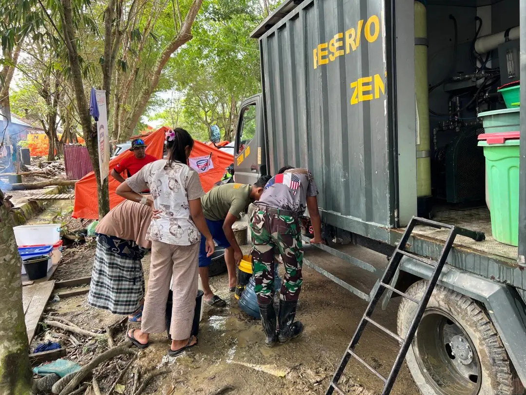 Penyaluran air bersih ini dibantu langsung dengan alat zeni, yaitu mobil Reverse Osmosis (RO) untuk mengolah air yang ada di sekitar lokasi menjadi air yang layak konsumsi secara cepat dan efisien. Dengan dukungan teknologi ini, hambatan ketersediaan air minum di titik-titik pengungsian dapat teratasi dengan baik.