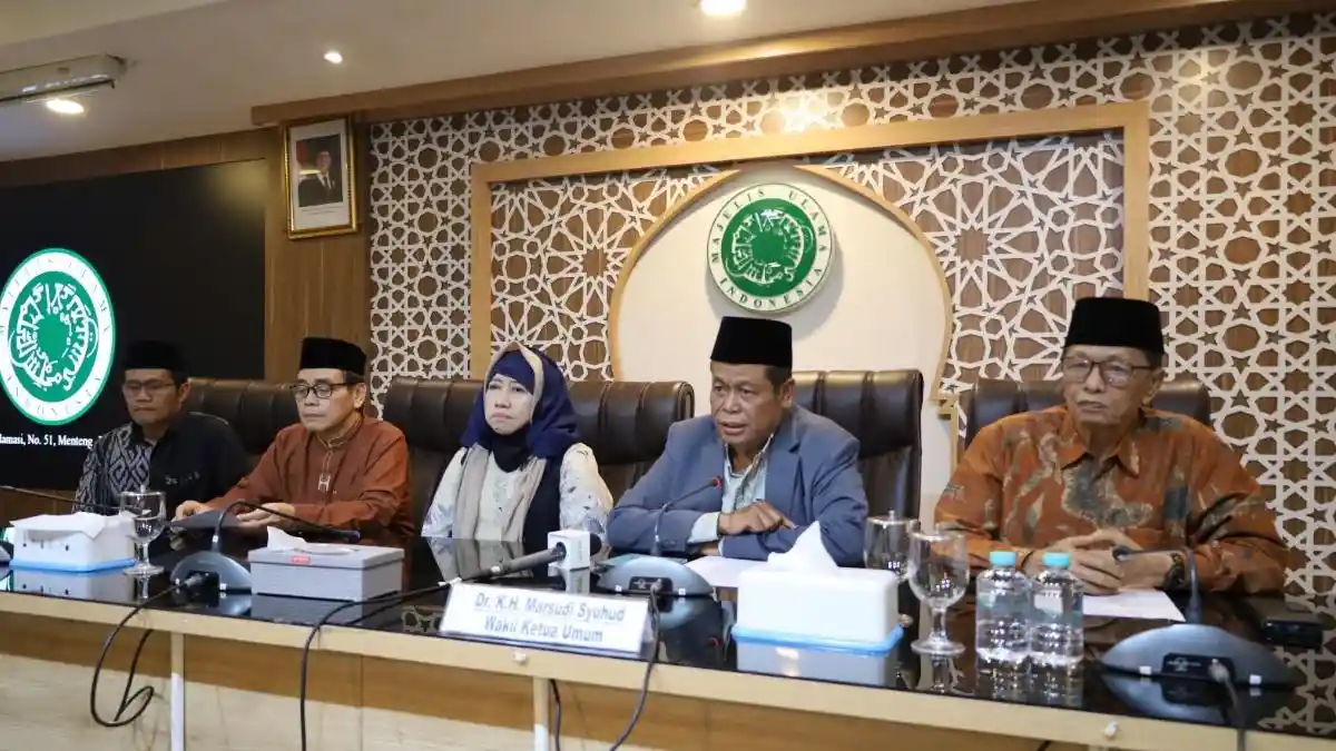 Taujihat MUI dibacakan secara bergantian oleh Waketum MUI K.H. Marsudi Syuhud, Ketua MUI Buya Pasni Rusli, Wasekjen MUI Hj. Safira Machrusah, Wasekjen MUI K.H. Arif Fahrudin, dan Ketua HLNKI MUI H. Bunyan Saptomo pada Senin (6/4/2026) di Kantor MUI Jakarta.