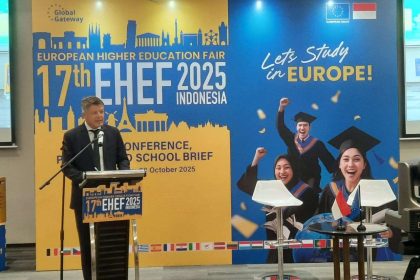 Duta Besar Uni Eropa untuk Indonesia, Denis Chaibi saat memberikan sambutan dalam konferensi pers European Higher Education Fair (EHEF) 2025 di Jakarta, Selasa (28/10/2025). (Foto: RRI/Rini Hairani) J...