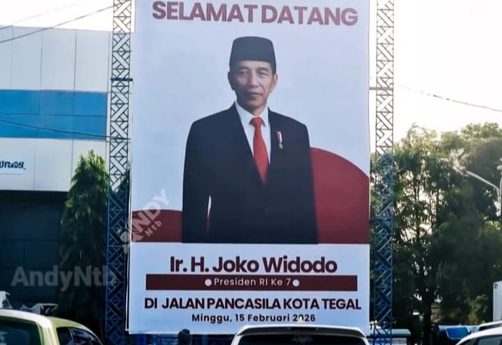 Tegal, REDAKSI17.COM – Pemasangan banner raksasa bergambar Joko Widodo di Jalan Pancasila, Kota Tegal, menjadi perbincangan hangat di media sosial. Banner tersebut menampilkan foto resmi dengan gaya kenegaraan disertai tulisan “Ir. H. Joko Widodo – Presiden RI Ke-7” dan narasi “Selamat Datang”, yang sekilas memberi kesan penyambutan kepala negara aktif.