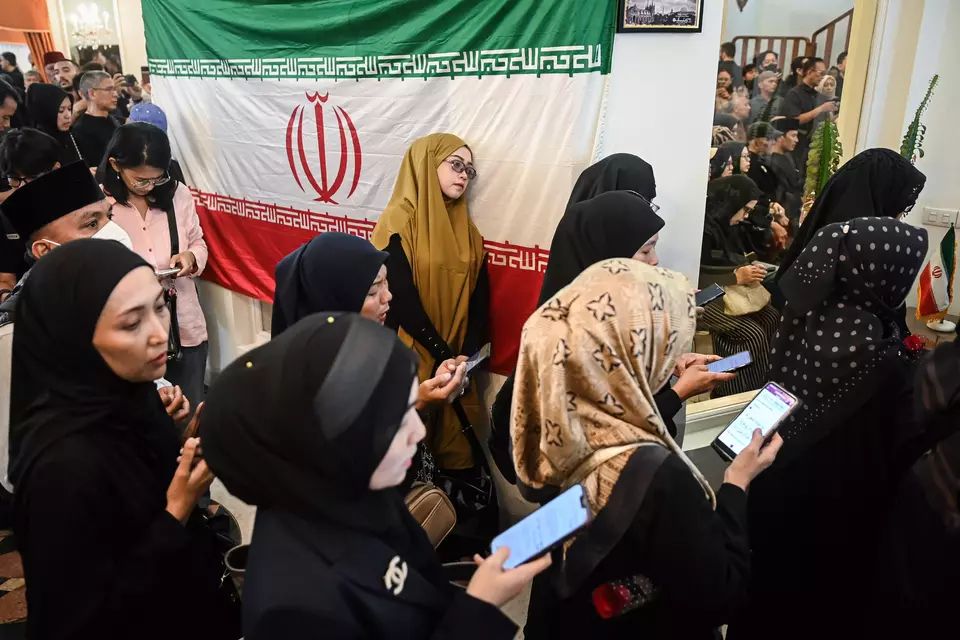 Warga berdoa untuk mendiang pemimpin tertinggi Iran Ayatollah Ali Khamenei di Kediaman Duta Besar Iran, Jakarta, Kamis 5 Maret 2026. (Antara Foto/Sulthony Hasanuddin)