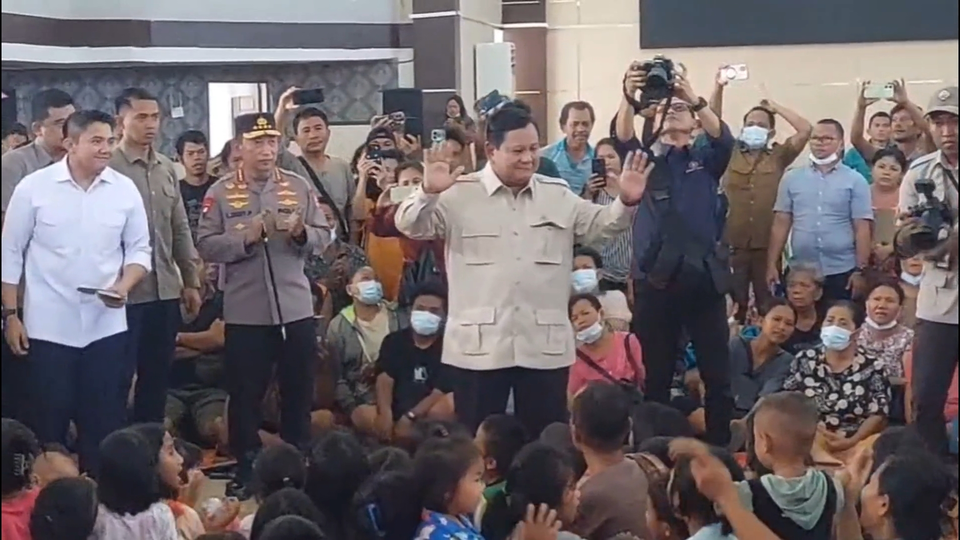 Presiden Prabowo Subianto saat menghibur anak-anak pengungsi korban banjir di Tapanuli Tengah, Sumatera Utara, Senin 1 Desember 2025. (Beritasatu.com/Panji Satrio)