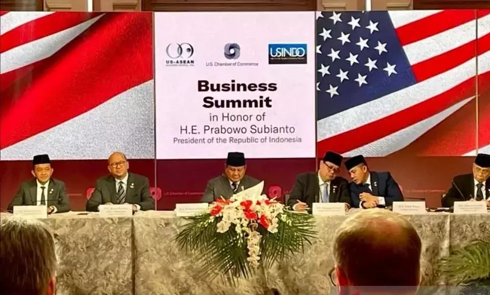 Presiden Prabowo Subianto (tiga kiri) menghadiri Business Summit untuk bertemu dengan komunitas usaha Amerika Serikat, yaitu USCC, USINDO, USABC, dan juga komunitas usaha Indonesia seperti Kamar Dagang dan Industri Indonesia di Gedung USCC, Washington DC, Amerika Serikat, Rabu (18/2/2026) waktu setempat. (Antara/Hafidz Mubarak A)