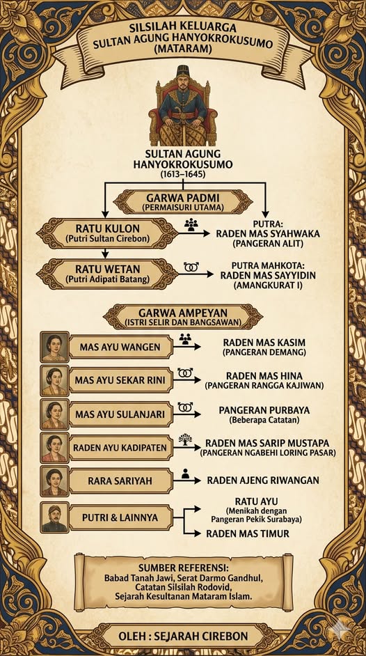 Silsilah Keturunan Sultan Agung Mataram dapat ditemui dalam beberapa sumber, dan dari sumber yang dapat dikumpulkan bahwa Sang Sultan punya dua Permaisuri dan 6 selir.