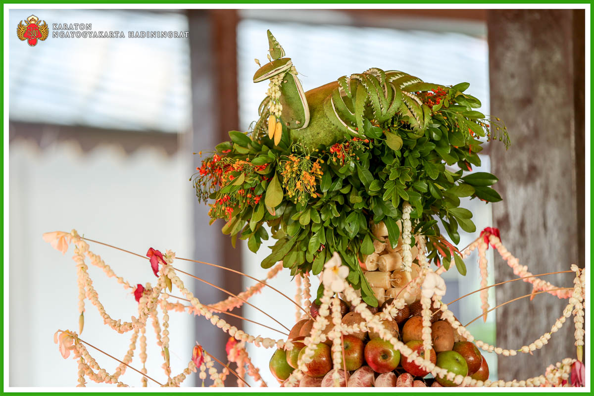 Pohon buah dibuat dari tujuh macam buah lokal yang dirangkai pada sebuah anyaman bambu, sehingga menyerupai bentuk sebuah pohon. Bilangan tujuh dalam bahasa Jawa disebut pituPitu di sini dimaksudkan agar memperoleh pitulungan atau pertolongan, keselamatan, dan kesejahteraan. Secara berurutan tujuh macam buah yang dirangkai pada pohon tersebut terdiri dari salak, sawo, apel malang, jeruk bali, rambutan, manggis, dan di bagian paling bawah terdapat pisang raja. Pisang raja melambangkan bahwa Raja Kasultanan Ngayogyakarta adalah pengayom bagi rakyatnya. Sebagai sentuhan terakhir, pohon buah ini akan dililit dengan untaian bunga melati yang melambangkan kesucian.